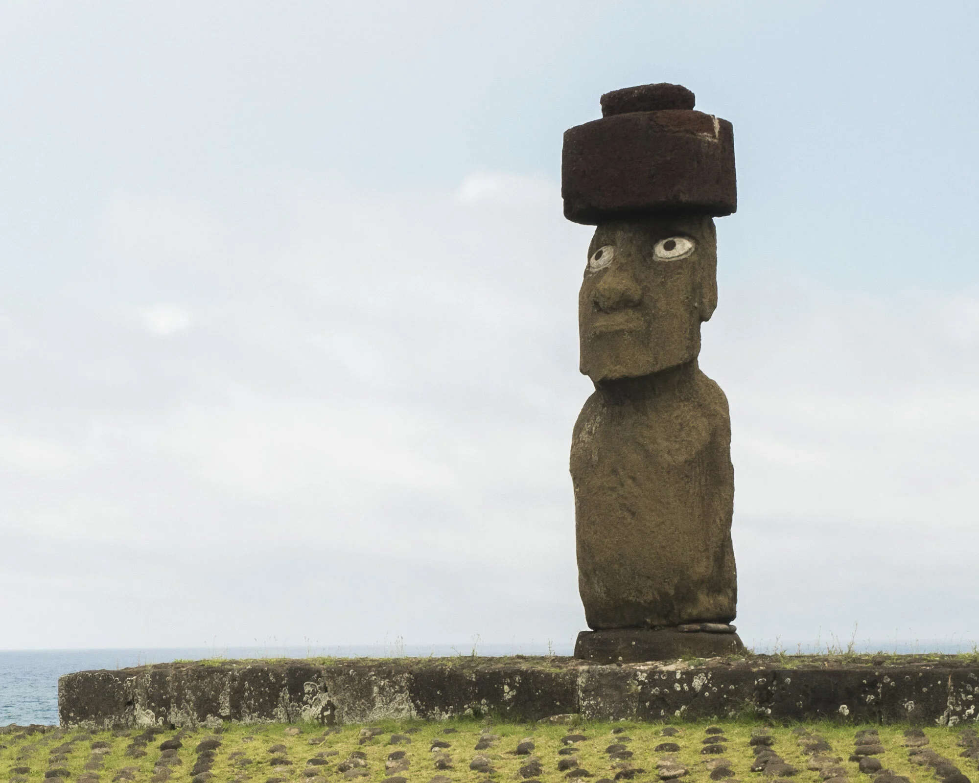 Regardless of this abuse on top of injury to Rapa Nui, the moai (the famous carved stone figures) are fascinating in their own right. Quarried from one end of the island, the figures are spread widely, in groups and singly on Ahu (long pedestals). The flat head is in good proportion when the pukao (a hat or top-knot) is put on the head.